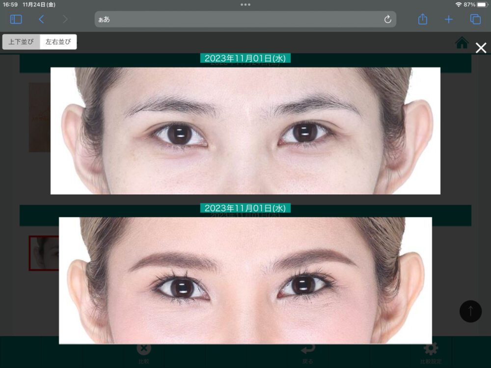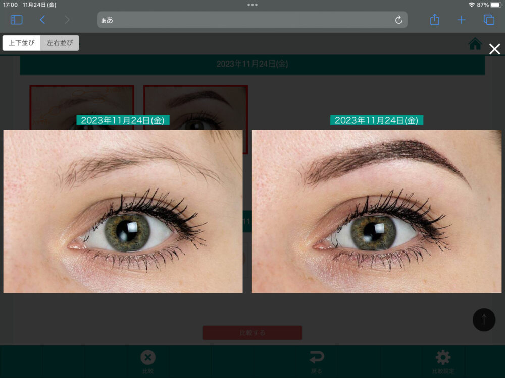 A’staffでは、保存した写真を2枚並べて比較確認できます。上下、左右と並び方を変更することもできます。