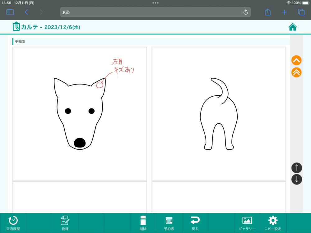 ペットの前後、左右の4つの手描き用台紙があります。台紙に注意点や施術のポイントなど手描きで描けます。